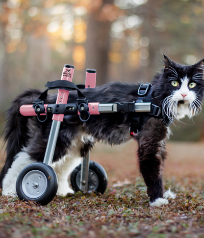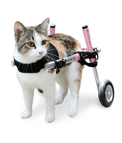 Fully adjustable in height, length and width. A Cat Walkin' Wheelchair improves mobility in cats who have become paralysed, recovering from a spinal condition or for cats dealing with weakened limbs from arthritis or degenerative joint disease. With the support of a wheelchair, your cat can remain active and regain their independence.