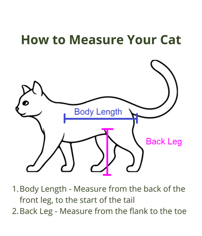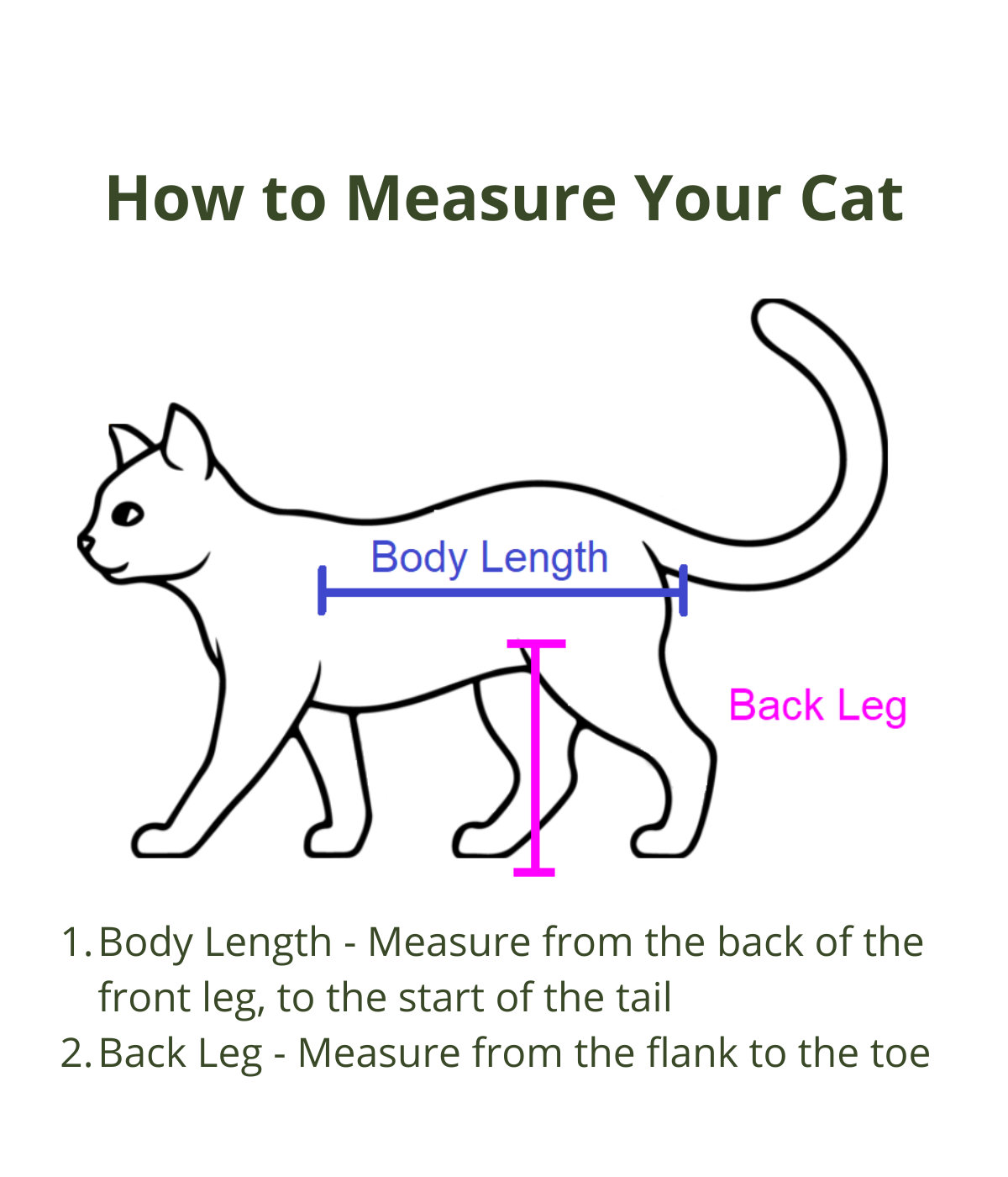 🐾 Measure the Rear Leg Height to the toe pad, either when you cat is lying down or standing, as shown in the diagram. Do not pull the leg tight, but leave some natural bend