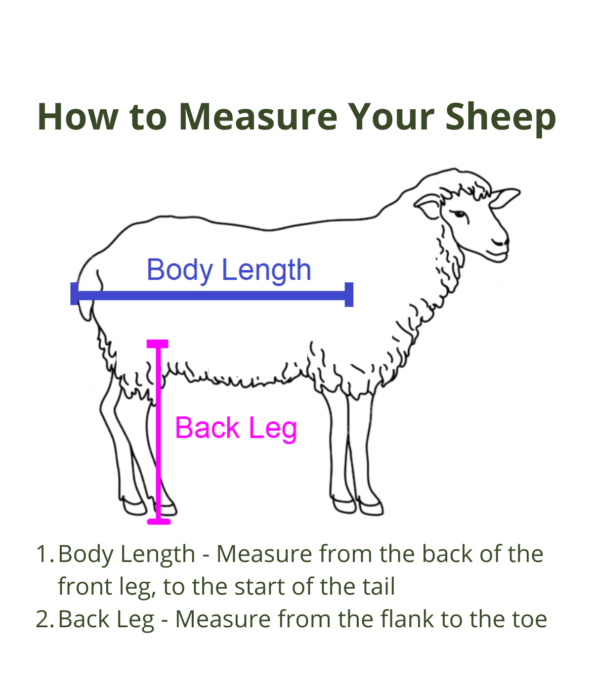 🐾 Measure the Rear Leg Height to the toe pad, either when you sheep or goat is lying down or standing, as shown in the diagram. Do not pull the leg tight, but leave some natural bend