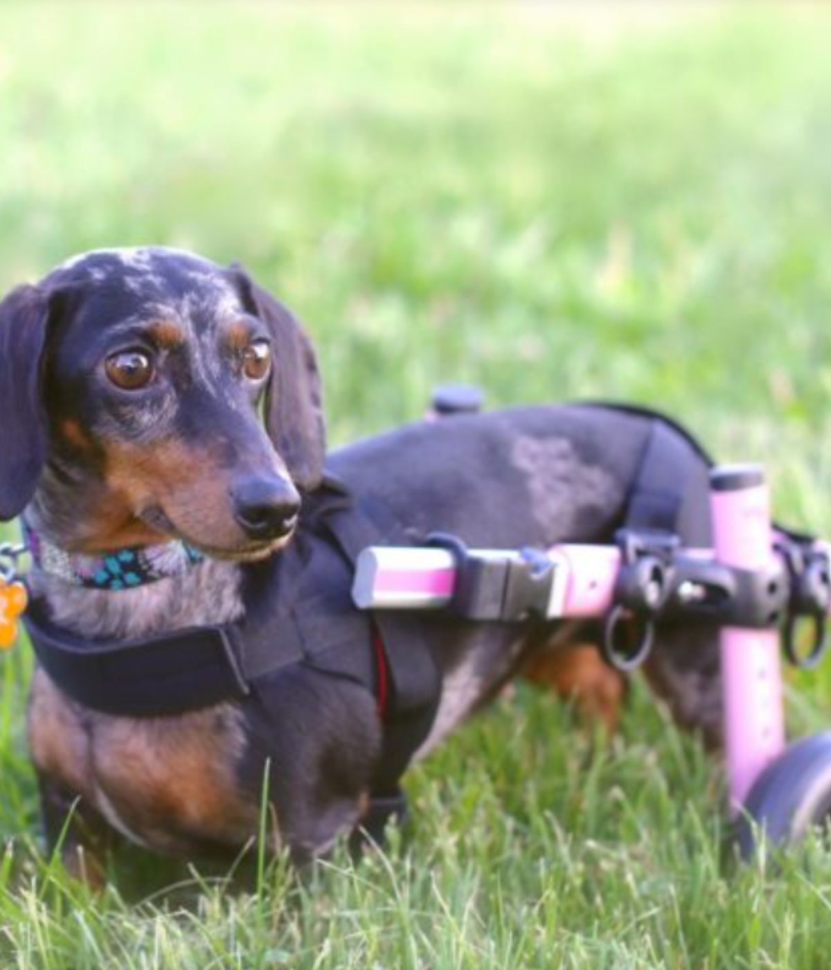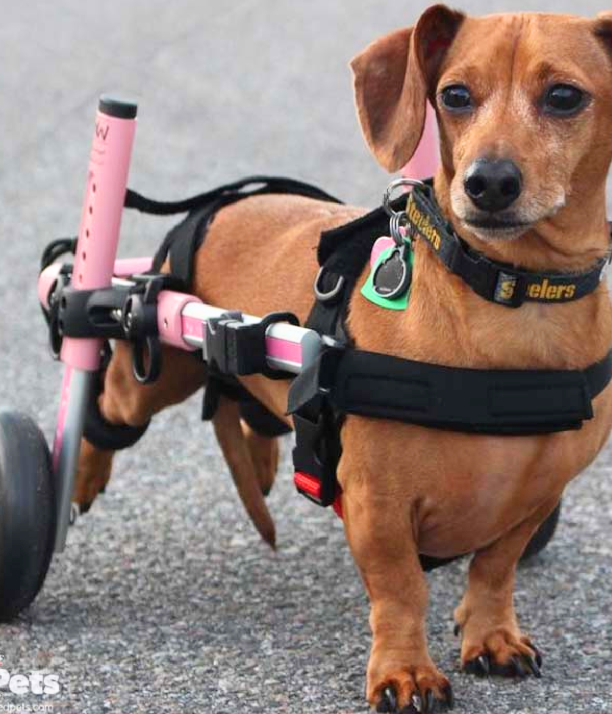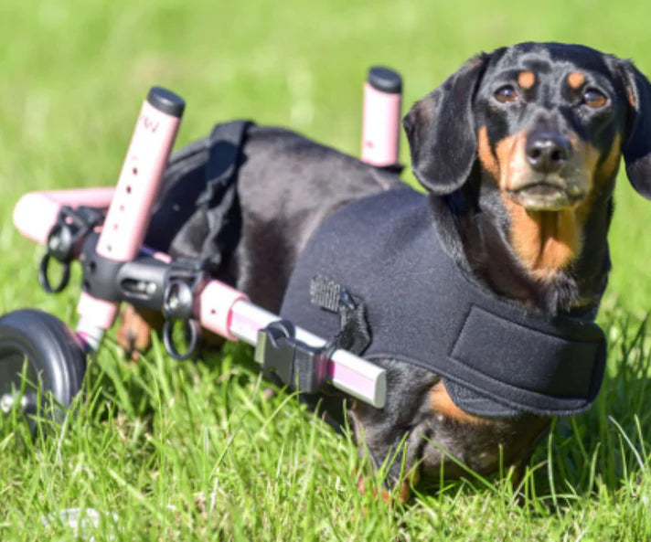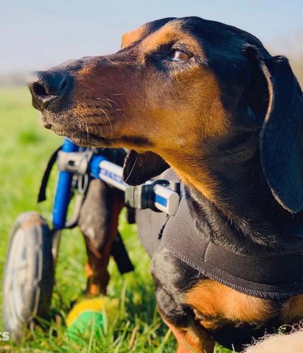 Walkin’ Wheels Rear Dachshund wheelchair gives dachshunds weighing up to 18kg or 40 pounds their mobility back!