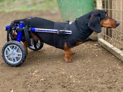 Fully adjustable in height, length and width, the dachshund rear wheelchair is specifically designed to accommodate a Daxie’s unique body shape with their short legs and long torso, giving them the rear leg support they need to exercise and stay healthy.